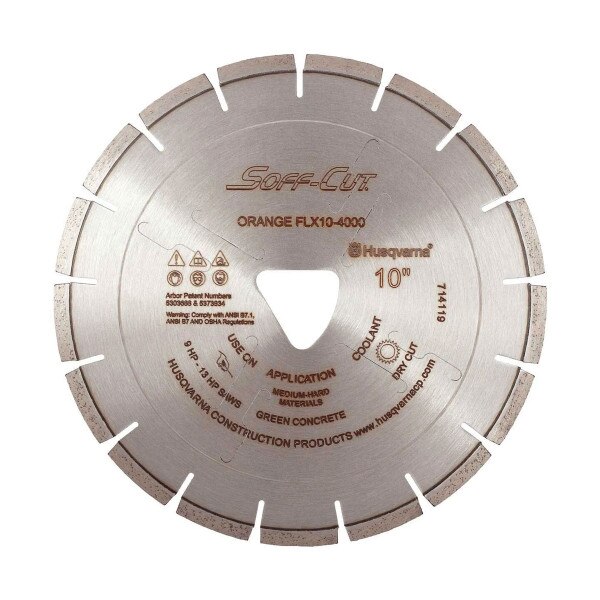 Husqvarna Soff-Cut FLX 4000 Orange Series Early-Entry Concrete Diamond Blade is designed to work specifically with the Soff-Cut® system, the only true, Ultra Early Entry™ system. Soff-Cut Excel 4000 Orange Series diamond blades are designed to cut green concrete with medium aggregate and medium abrasive sand.